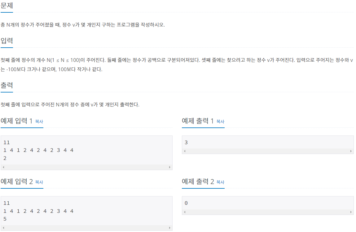 첫째 줄에 정수의 개수 N(1 ≤ N ≤ 100)이 주어진다. 둘째 줄에는 정수가 공백으로 구분되어져있다. 셋째 줄에는 찾으려고 하는 정수 v가 주어진다. 입력으로 주어지는 정수와 v는 -100보다 크거